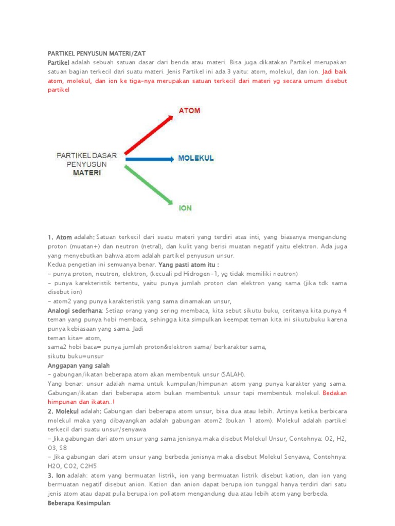 Molekul adalah kumpulan atom dua atau lebih dalam suatu susunan tertentu yang terikat oleh ikatan kimia. Partikel Partikel Materi Sebelum mengenal partikel ada baiknya kita mengenal apa yang disebut materi itu. Pengertian atom yang kedua oleh Aristoteles pada tahun 384 SM dan 332 SM bahwa materi dapat dibagi terus menerus menjadi bagian yang lebih kecil.