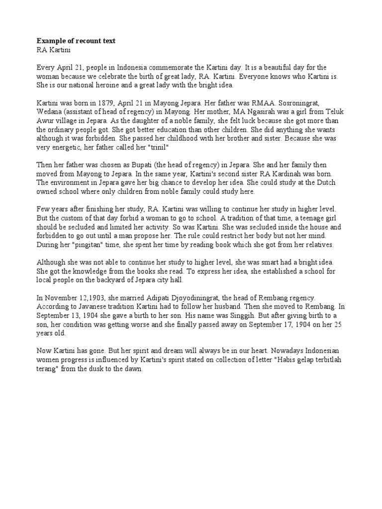 Every April 21 people in Indonesia commemorate the Kartini day. Kartini is the fifth child of eleven siblings from her biological mother and also from her stepmother. Recount Text RA Kartini Sunday August 18th 2013 at 140 am EXCELLENT ONLINE ENGLISH COURSE The following is the example of Recount Text.