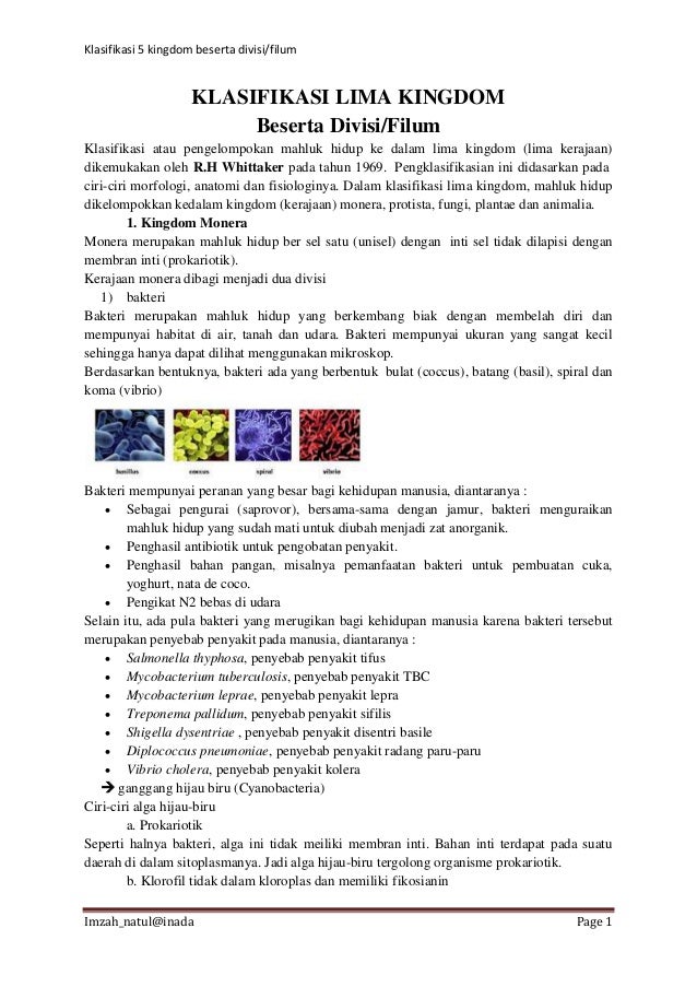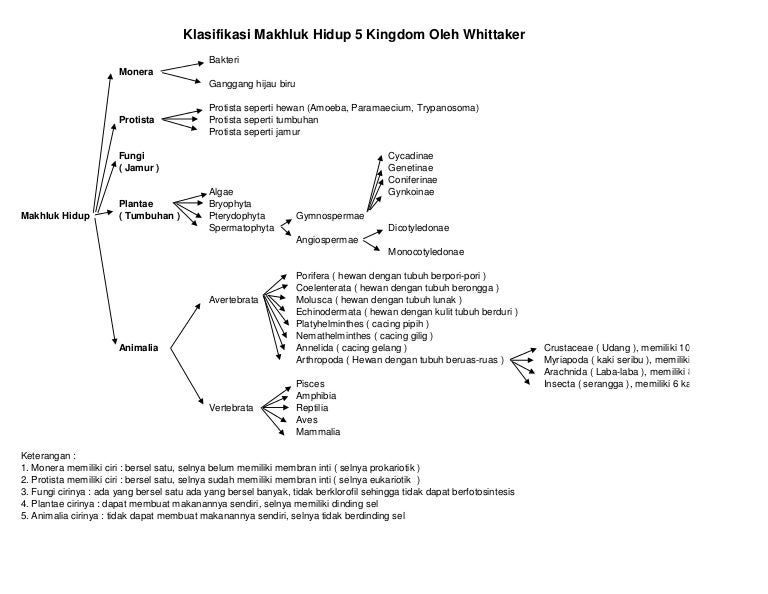 Klasifikasi makhluk hidup 5 kingdom. Kelemahan sistem ini tidak sepenuhnya mencerminkan hubungan. Klasifikasi ini disebut juga klasifikasi lima kingdom. Skema klasifikasi lima kingdom yang diperkenalkan oleh whittaker banyak digunakan sekarang ini.