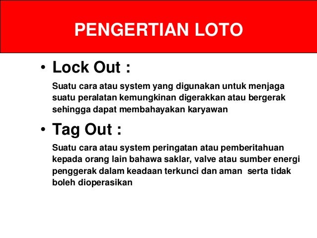Definisi LOTO lock out tag out tidak banyak dijelaskan dalam regulasi terkait keselamatan dan kesehatan kerja di IndonesiaMenurut Keputusan Menteri Permukiman dan Prasarana Wilayah nomor 384 tahun 2004 tentang Pedoman Teknis Keselamatan dan Kesehatan Kerja pada Tempat Kegiatan Konstruksi Bangunan Lock-out adalah penguncian pada pusat kendali control point. Pengertian K3 secara Filosofi adalah upaya untuk menjamin keutuhan dan kesempurnaan tenaga kerja dan manusia pada umumnya hasil karya dan budayanya menuju masyarakat yang adil dan sejahtera. PENGERTIAN LOTTO LOCK OUT AND TAG OUT Pengertian Definisi LOTO Lockout Tagout ialah suatu prosedur untuk menjamin mesinalat berbahaya secara tepat telah dimatikan dan tidak akan menyala kembali selama pekerjaan berbahaya ataupun pekerjaan perbaikan perawatan sedang berlangsung sampai dengan pekerjaan tersebut telah selesai.